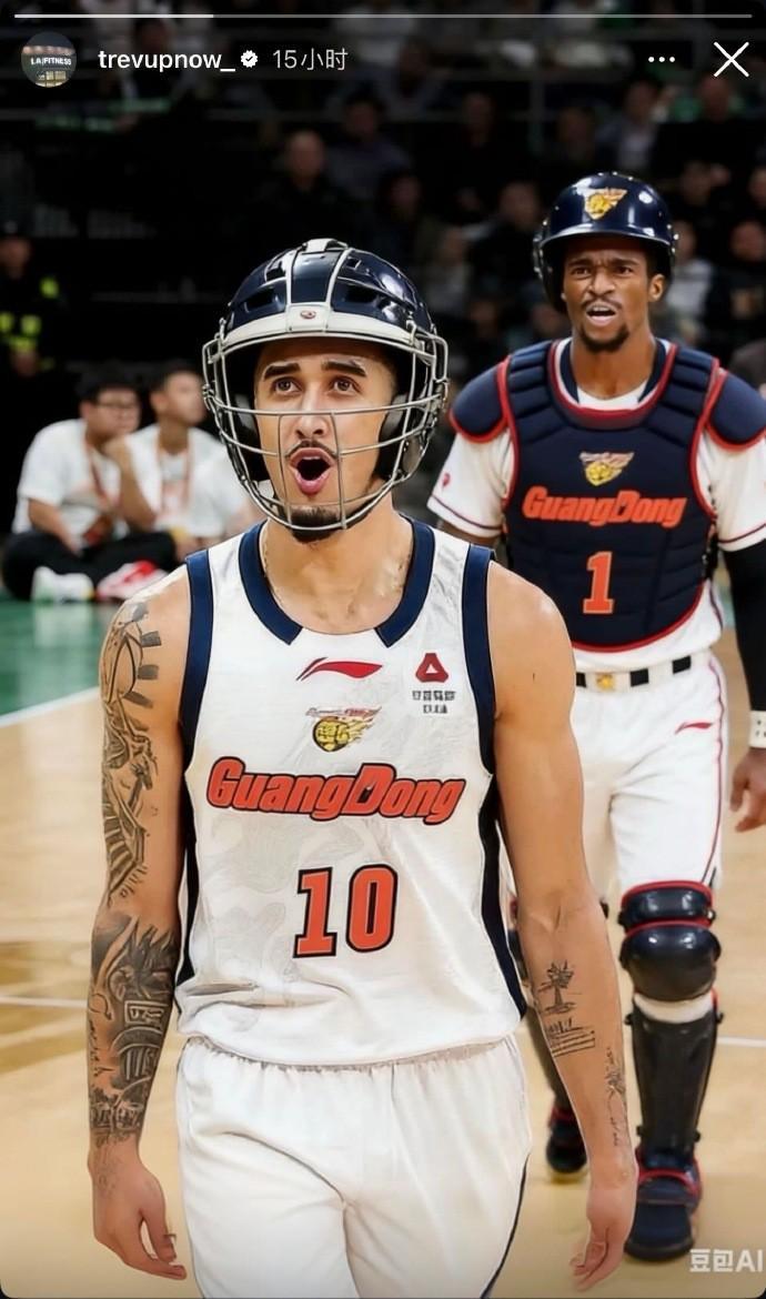 赛后,广东外援萨姆纳和奎因都在社媒发了一张自己带护具上场的AI图片。