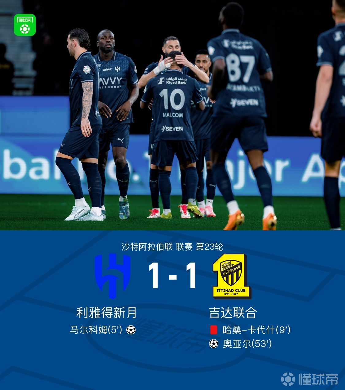 北京时间2月22日,沙特联第23轮,利雅得新月主场对阵吉达联合。比赛中,马尔科姆闪击,哈桑-卡代什染红,奥亚尔头槌扳平。最终,利雅得新月1-1十人吉达联合。