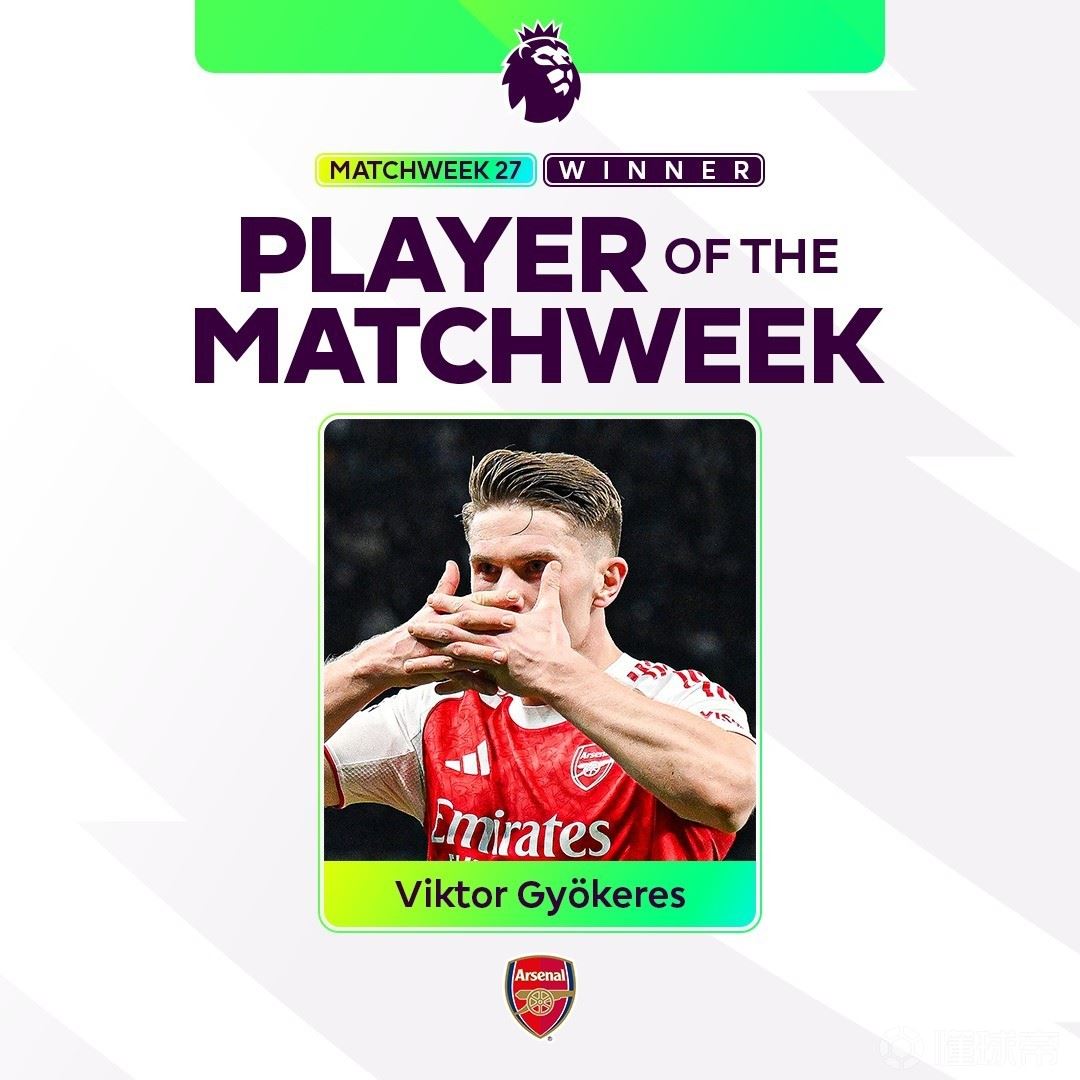 英超官方宣布,阿森纳的维克托-哲凯赖什当选为第27轮英超本周最佳球员,击败了奥赖利、埃泽、米尔纳等人。