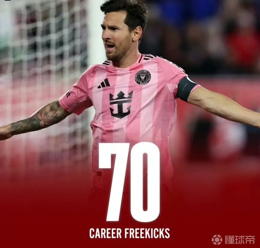 梅西成为足球史上任意球进球第四多的球员。1. 马塞利诺·卡里奥卡 — 78球2. 罗伯托·迪纳米塔 — 75球3. 小儒尼尼奥 — 72球4. 梅西 — 70球5. 马科斯·阿松桑 — 69球6. 济科 — 68球7. 西尼沙·米哈伊洛维奇 — 67球8. 皮埃尔·范霍伊东克 — 65球9. C罗 — 63球10. 马拉多纳 — 61球
