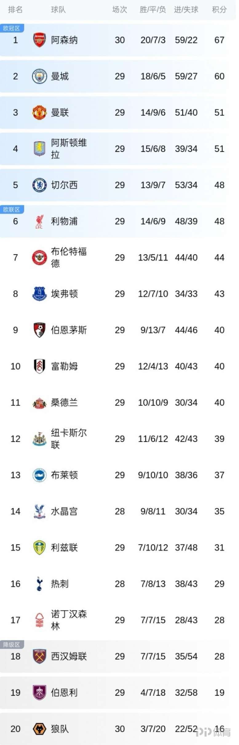 目前,阿森纳的67分领先曼城60分,位列第三的曼联与第六名利物浦分差仅3分。降级区西汉姆联、伯恩利和狼队仍处于保级压力之下,排名最后的狼队以16分深陷降级区。