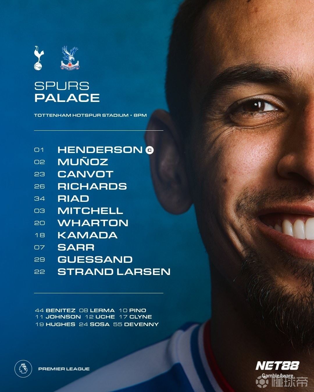 水晶宫首发:1-迪恩-亨德森、34-里亚德、26-理查兹、23-康沃、2-穆尼奥斯、20-亚当-沃顿、18-镰田大地、3-米切尔、7-伊斯梅拉-萨尔、29-盖桑、22-拉森