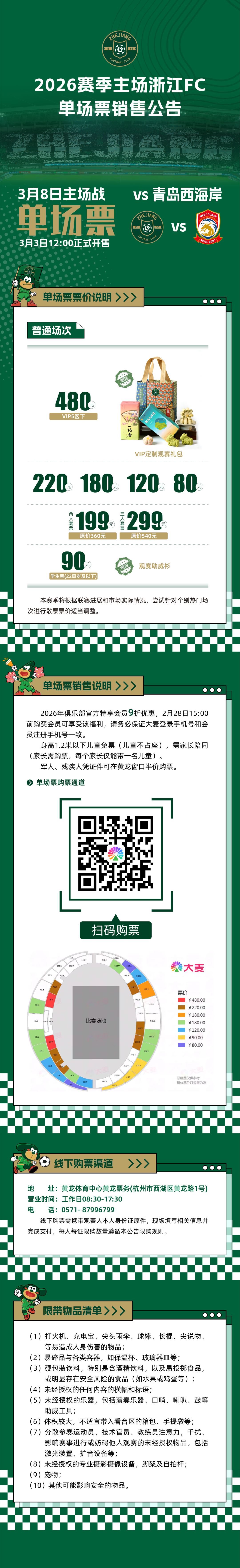 据悉,浙江绿城队本周日中超首轮主场迎战西海岸的单场票已经开售,新赛季年票于3月2日正式发售。这支焕然一新的队伍希望有更多球迷到黄龙体育场加油呐喊,也希望能给球迷带来更多的胜利和欢乐。