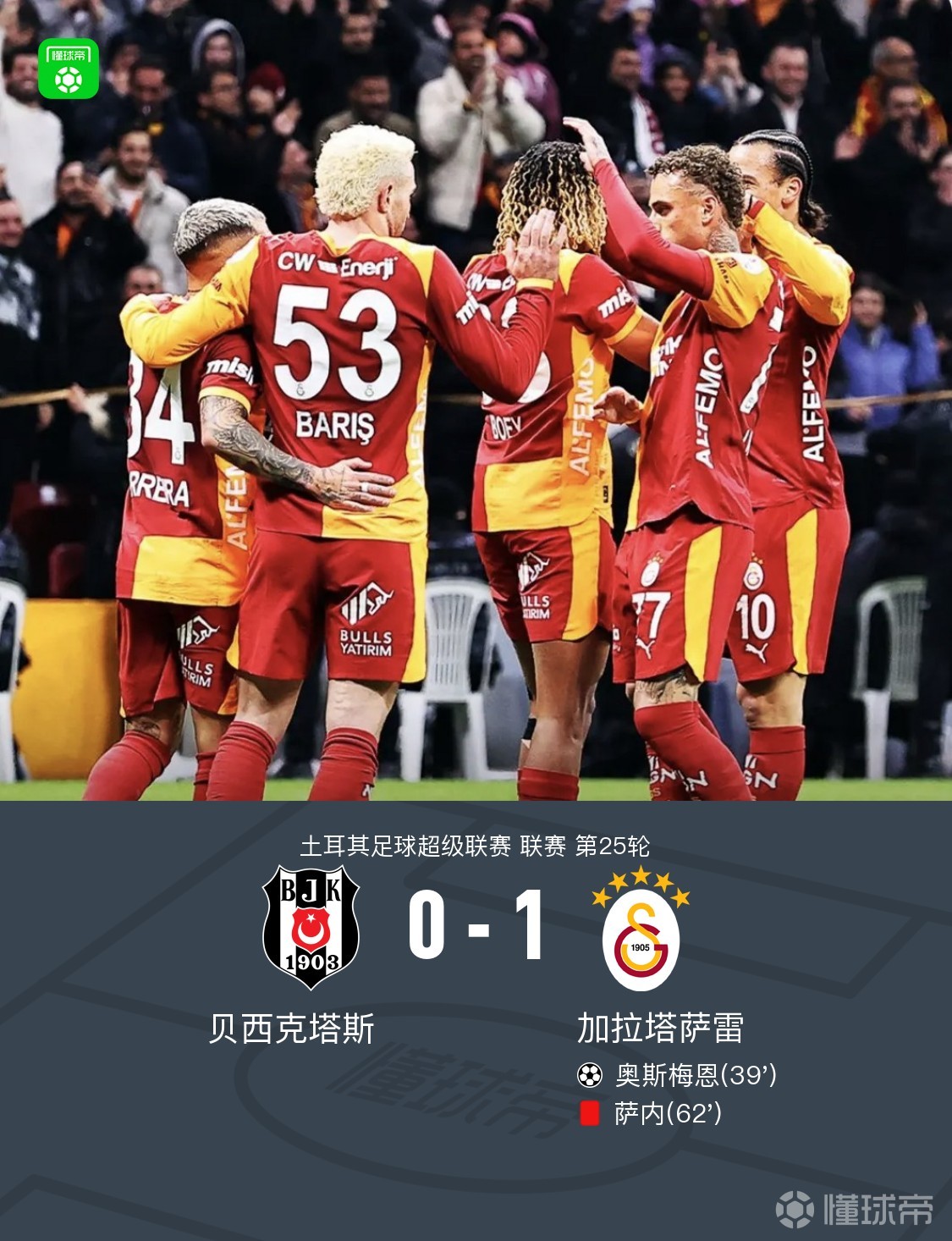 北京时间3月8日土耳其足球超级联赛第25轮,贝西克塔斯主场对阵加拉塔萨雷。上半场奥斯梅恩头槌破门首开记录,下半场萨内踩踏犯规被裁判红牌罚下。最终比分贝西克塔斯 0-1 加拉塔萨雷。