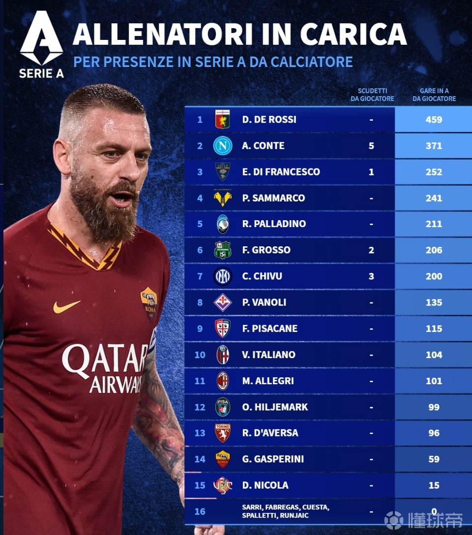 北京时间3月10日,德转统计出了意甲20家俱乐部现任主帅球员生涯的意甲出场数排名,热那亚主帅德罗西以459场排名第一,那不勒斯主帅孔蒂371场第二。