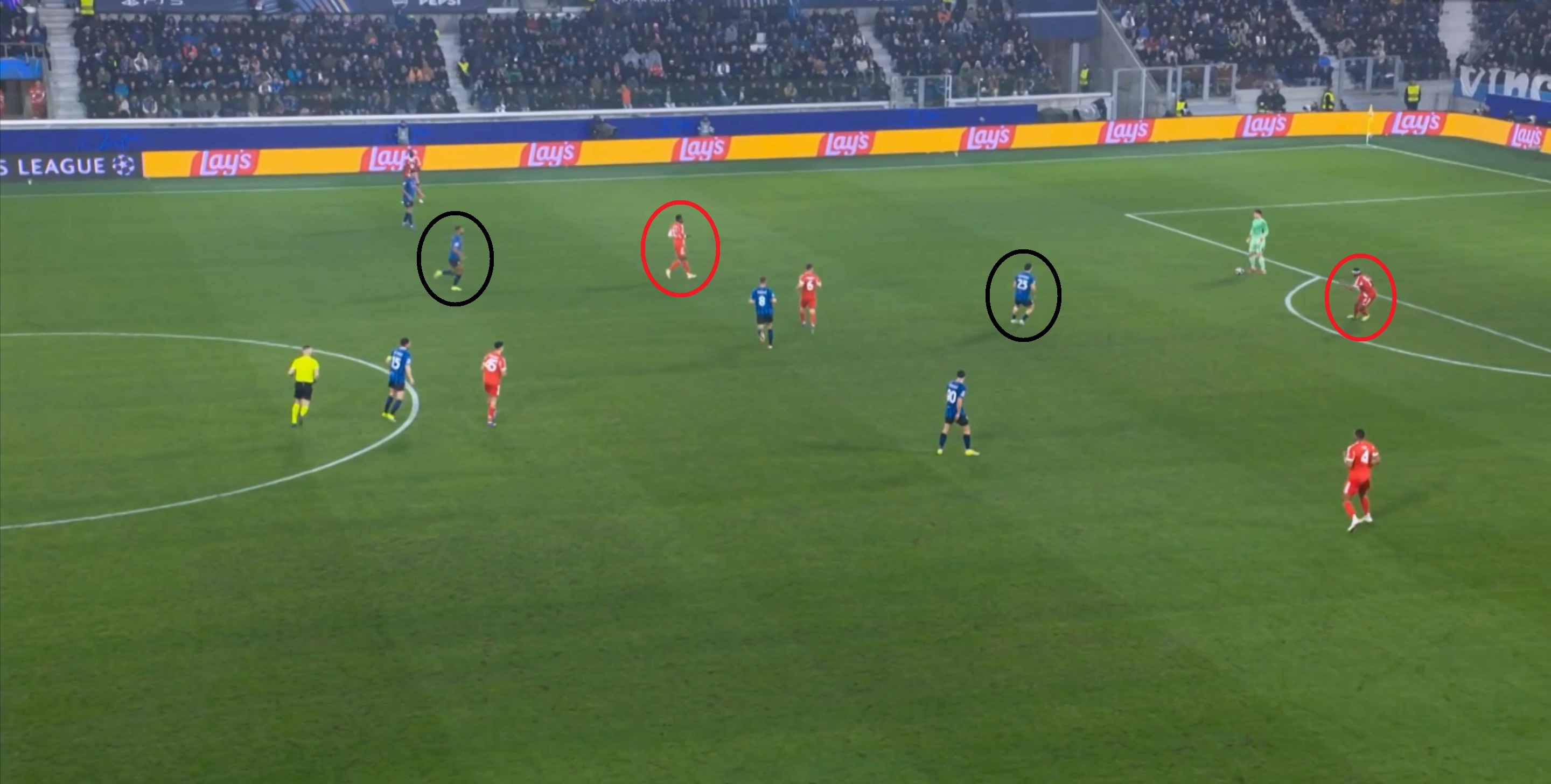 拜仁后场直接起长球的时候,你就能看到亚特兰大的最后一线只剩三人,而且三人都有自己的盯防对象,实际上就是三打三,根本没有人数优势: