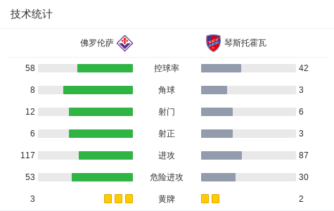 第60分钟,打破僵局!布鲁内斯低射破门,佛罗伦萨0-1琴斯托霍瓦