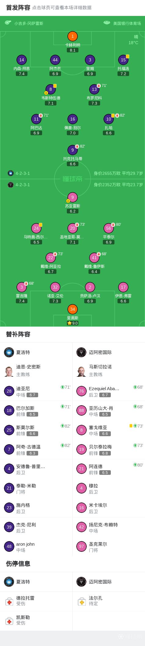 北京时间3月15日美国职业大联盟常规赛,夏洛特主场对阵迈阿密国际。本场比赛梅西缺阵,上半场双方互有攻防,但未能转换成进球。下半场,苏亚雷斯禁区内倒地,裁判未作表示。里奥斯高接低挡保球门不失。比赛尾声,马斯切拉诺因对裁判判罚不满吃到红牌被罚出场。最终,夏洛特0-0迈阿密国际。