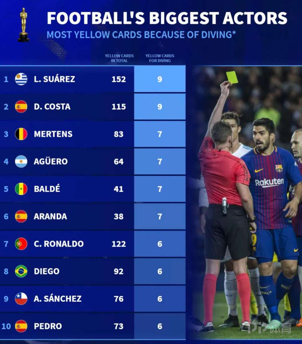 德转统计了球员各项赛事(足坛前十联赛)得黄牌次数榜,以及因假摔得黄牌次数榜。苏亚雷斯共得152张黄牌;科斯塔共得115张黄牌。两人都各以9张因假摔黄牌并列榜单第一。