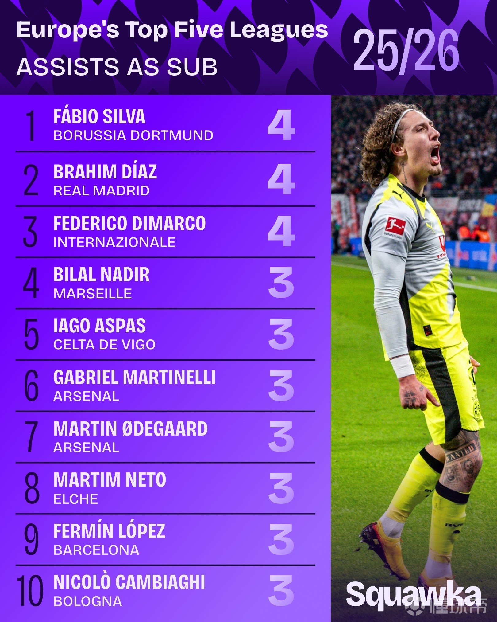 据统计,法比奥-席尔瓦、卜拉欣-迪亚斯和迪马尔科是本赛季欧洲五大联赛作为替补送出助攻并列最多的球员。