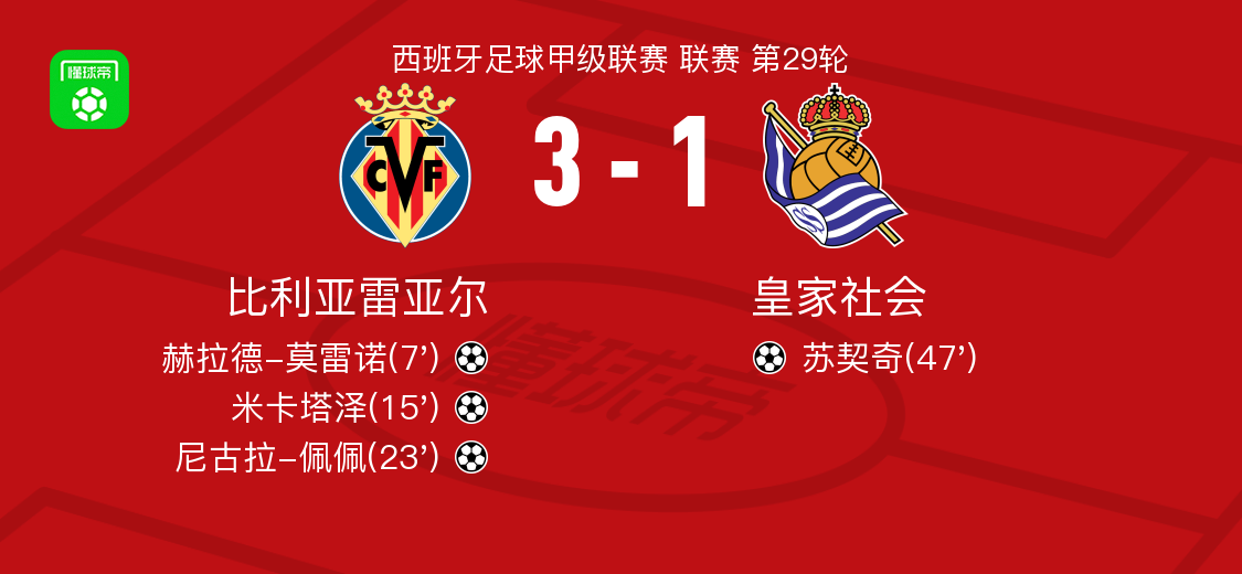 北京时间3月21日西班牙足球甲级联赛 联赛 第29轮,比利亚雷亚尔主场对阵皇家社会。比利亚雷亚尔赫拉德-莫雷诺破门,米卡塔泽破门,尼古拉-佩佩破门。皇家社会苏契奇破门。最终比分比利亚雷亚尔 3-1 皇家社会。