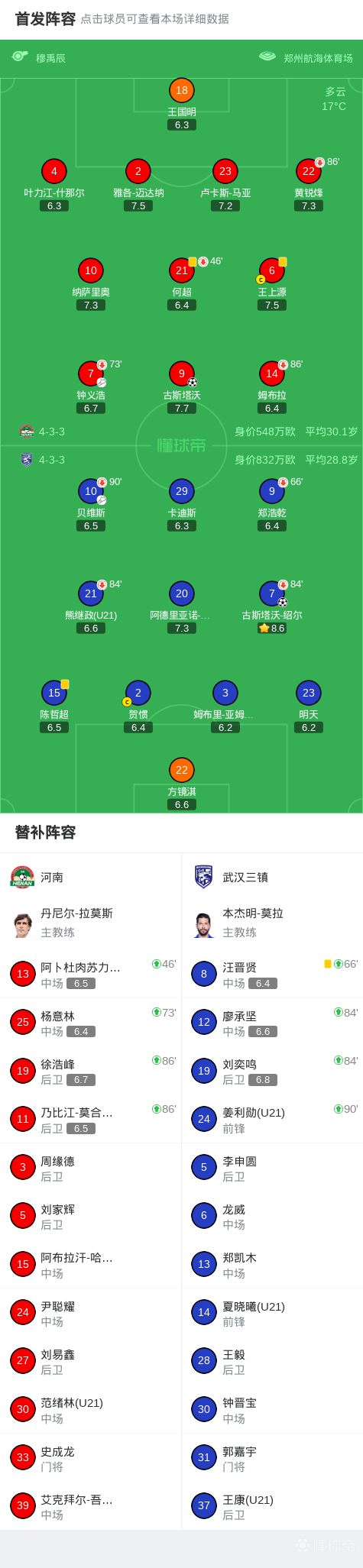 北京时间3月21日中国足球超级联赛 联赛 第3轮,河南主场对阵武汉三镇。上半场方镜淇一度手指错位,经过复位继续坚持比赛。下半场钟义浩传中,古斯塔沃头球破门,之后贝维斯传球,绍尔领球进入禁区后破门。最终河南1-1战平三镇。