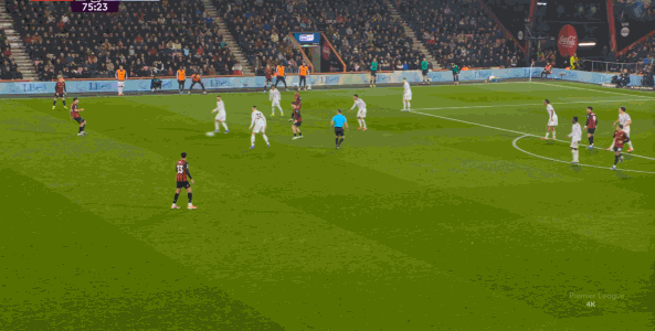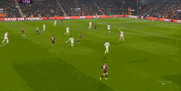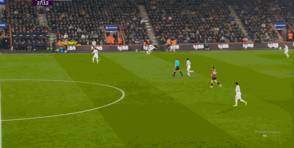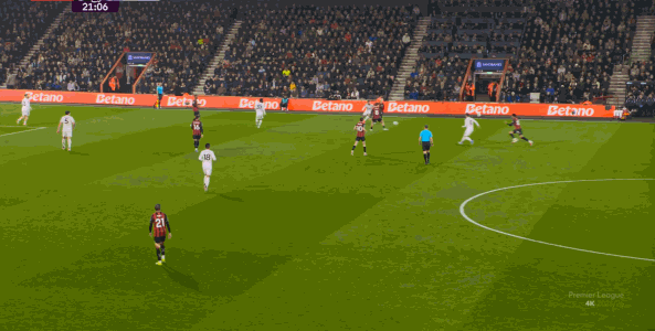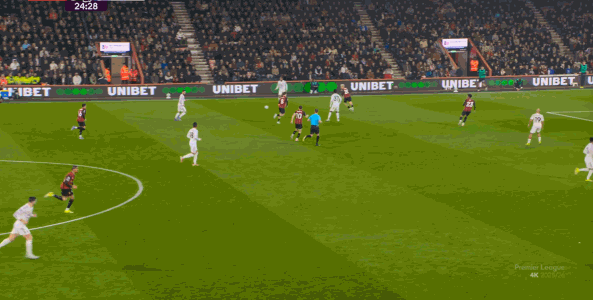 那么在这场比赛,曼联的弱点是如何暴露出来的?其实就发生在第27分钟这次高位逼抢,伯恩茅斯分到边路之后,库尼亚稍微松懈一点点,他们就成功抢到了卡塞米罗的身前,从而制造了他的黄牌: