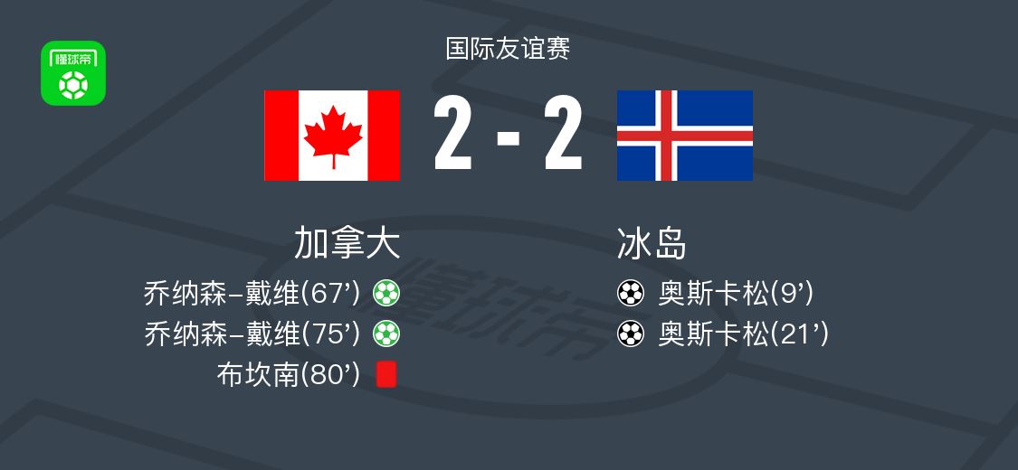 北京时间3月29日国际友谊赛,加拿大对阵冰岛。加拿大乔纳森-戴维梅开二度。冰岛奥斯卡松梅开二度。最终比分加拿大 2-2 冰岛。