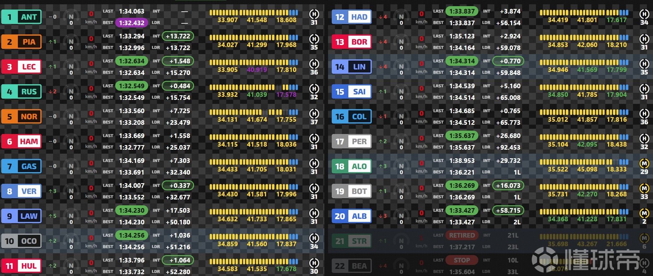 拉塞尔在干净空气里暂时领跑,随后进站落在皮亚斯特里身后。