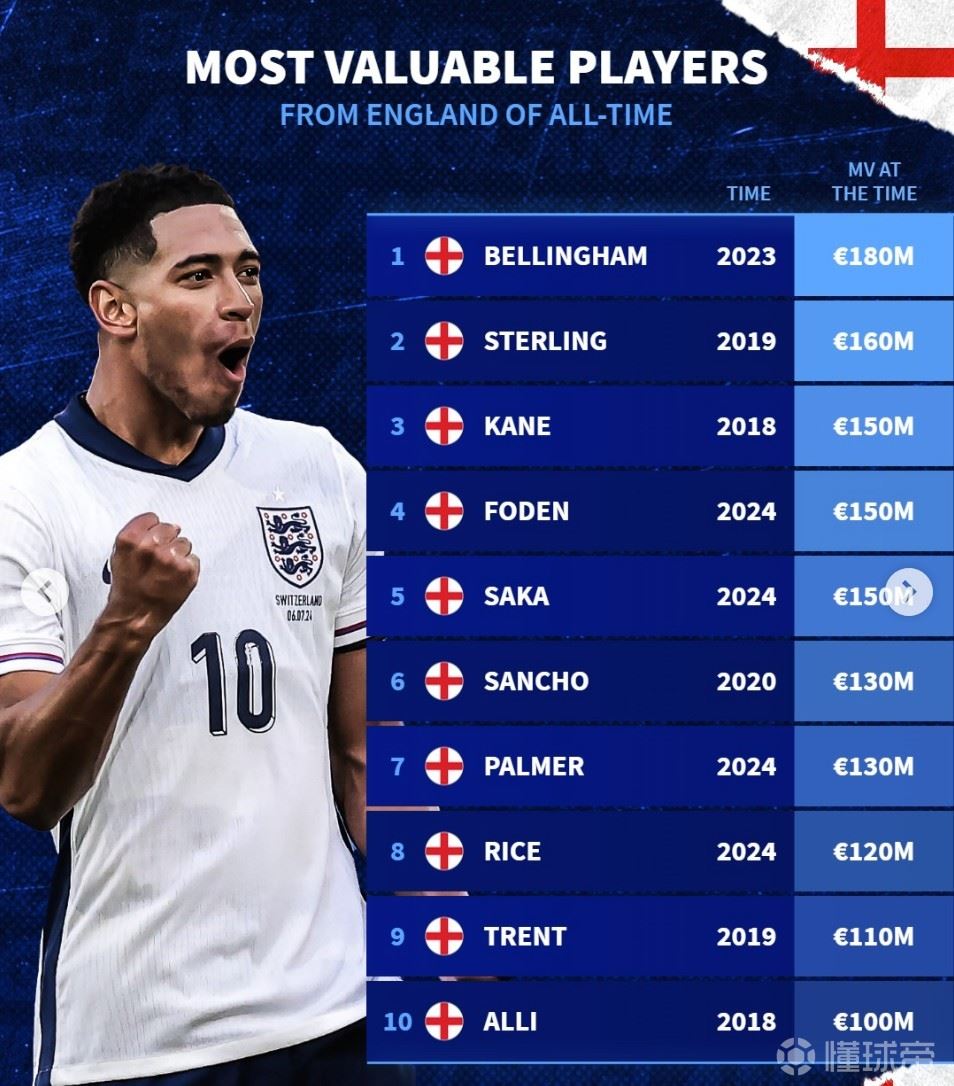 北京时间3月31日,德转列出了英格兰球员历史身价榜,贝林厄姆1.8亿欧元第一,斯特林1.6亿欧元第二,哈里-凯恩、福登、萨卡同以1.5亿欧元并列第三。