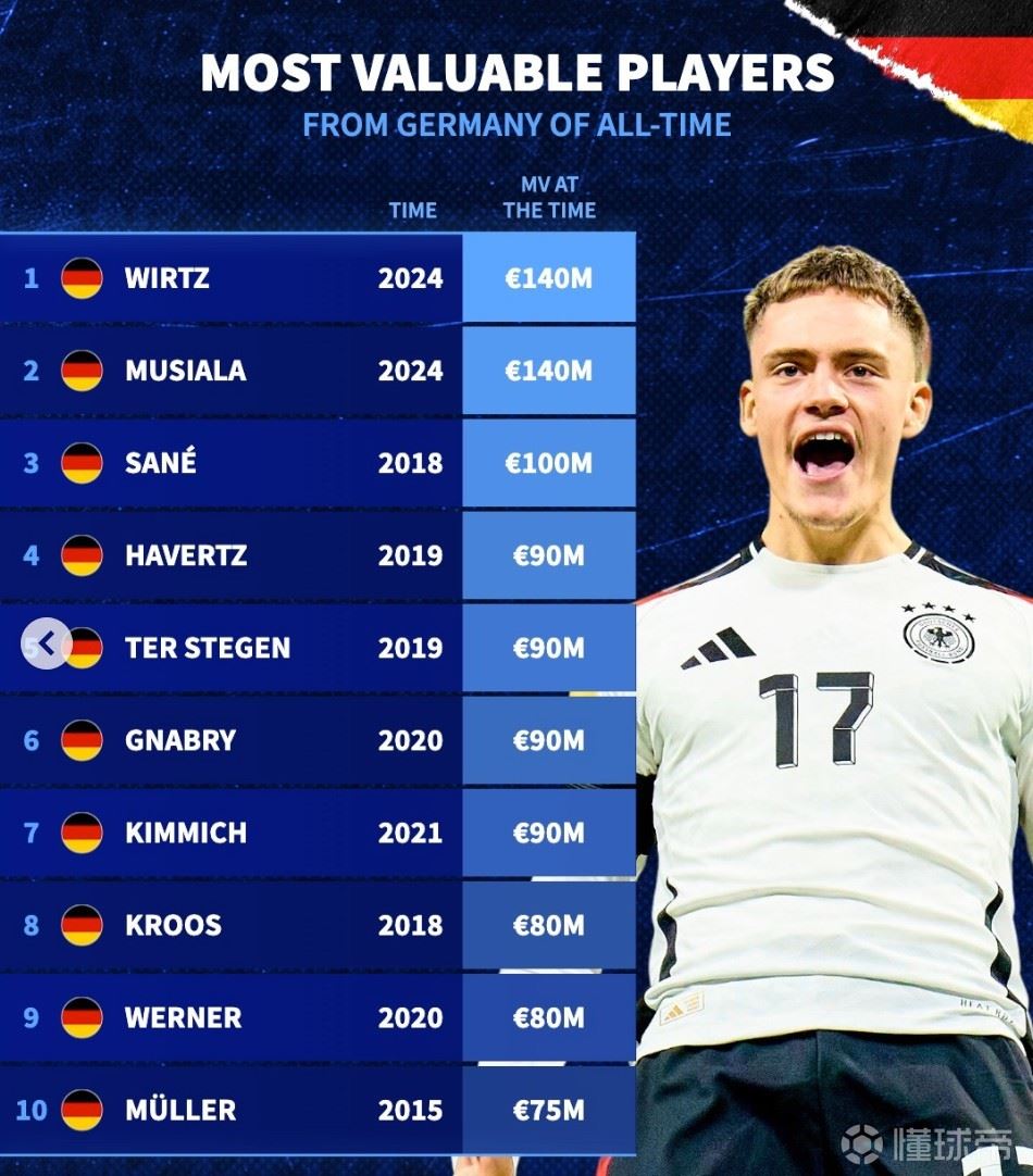 北京时间3月31日,德转列出了德国球员历史身价榜,维尔茨和穆西亚拉同以1.4亿欧元并列第一,萨内1亿欧元第三,维尔纳上榜。
