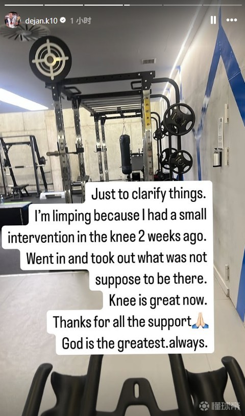 库卢塞夫斯基写道:“澄清一下,我走路一瘸一拐的,因为两周前我做了个膝盖小手术。手术取出了膝盖里不应该有的东西,膝盖现在感觉好多了,感谢大家的支持,上帝最伟大,永远如此。”