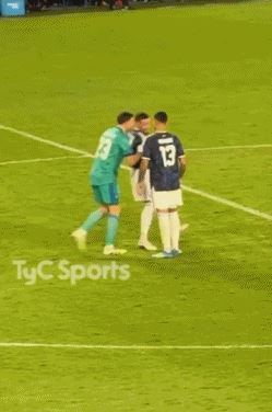 看到这一幕,马丁内斯冲过来推了奥塔门迪一把,罗梅罗更是推着奥塔门迪向前走了10米。帕雷德斯、麦考利斯特也先后与奥塔门迪击掌,梅西同样走过来与奥塔门迪击掌。