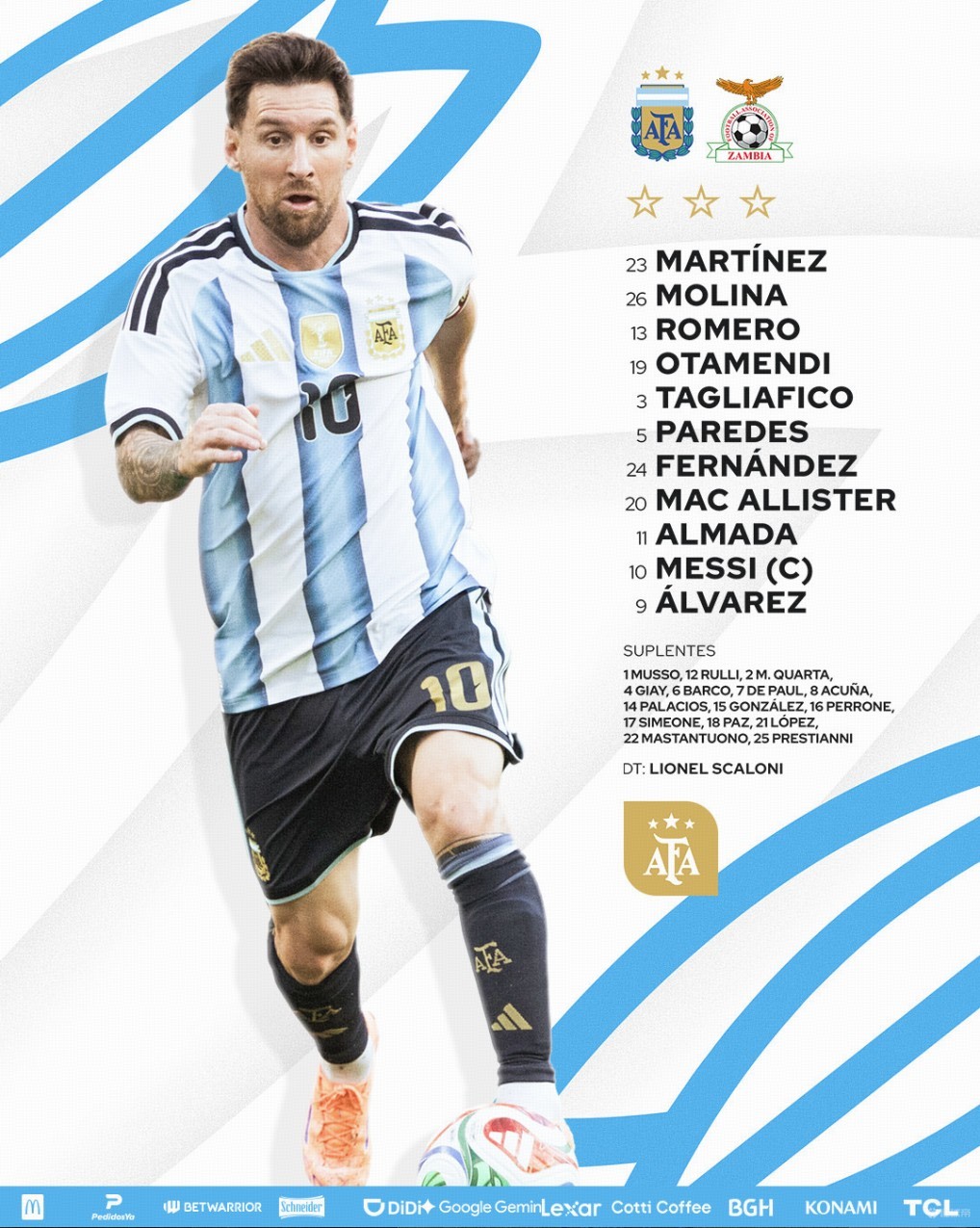 北京时间4月1日7点15分,国际友谊赛阿根廷对阵赞比亚,赛前公布首发名单。
