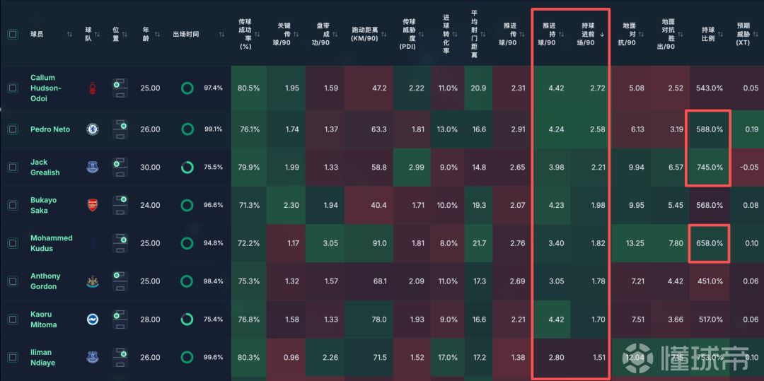 因此,通常情况下,要想这些球员发挥好,大部分情况下都是安排在弱侧,或者留在前场当突前前锋(往边路带),给中路后插上的队友拉空间,保持继续快速推进,所以大部分这样的球员,持球比例都不会很高: