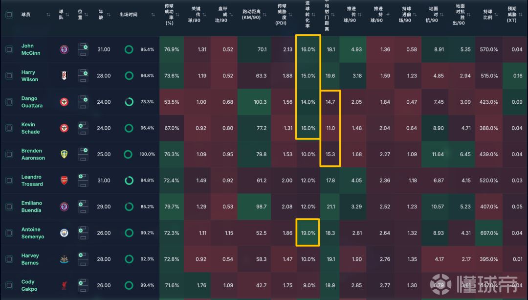 而库杜斯浪射紧随其后,格拉利什也挺拉的,因为他是这么多转化率低的边锋里,唯一一个平均射门距离最近的一个(14米)。