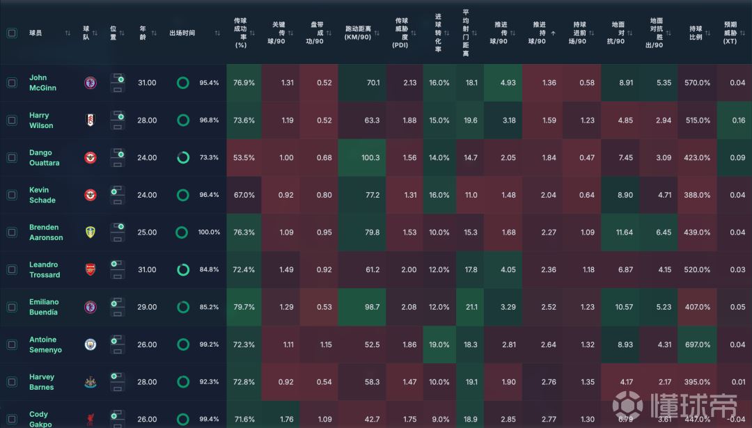 这里维拉的麦金和布恩迪亚,以及利兹联的阿伦森,都是中场属性更强的,虽然推进、关键传球都一般般,但是跑动很大程度上弥补了他们的战术缺陷。