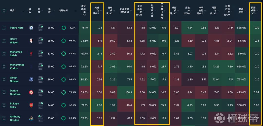 切尔西的内托还是高居第一,在进球转化率不错的情况下,还有较为出色的关键传球,那真的是能传能射,算是切尔西一根隐形的大腿。(不知道内托在切尔西球迷群体里风评怎么样,但是我个人确实挺喜欢这个球员的)