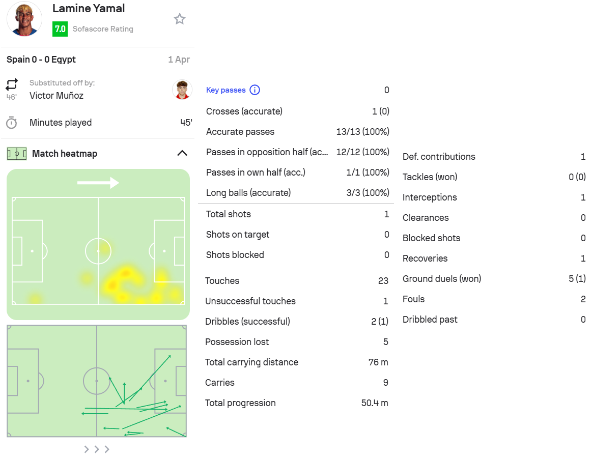 6.亚马尔,西班牙0-0埃及,首发出场45分钟。