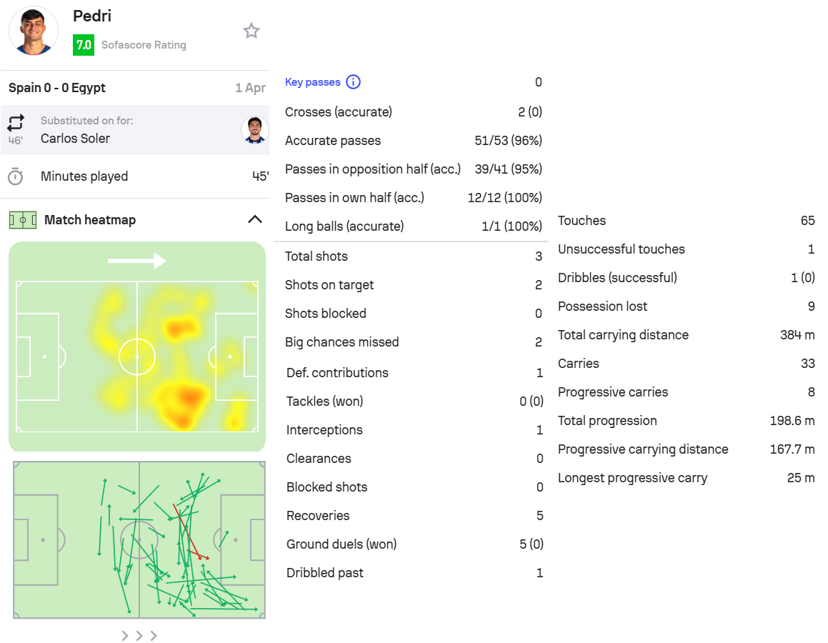 5.佩德里,西班牙0-0埃及,第46分钟替补出场。