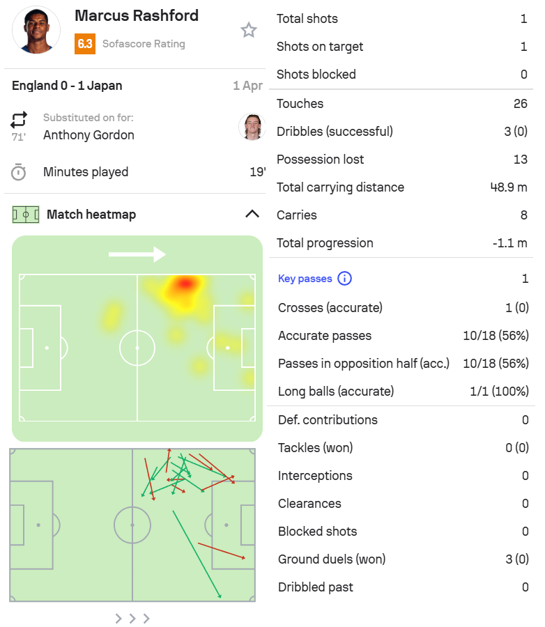 9.拉什福德,英格兰0-1日本,第71分钟替补出场。