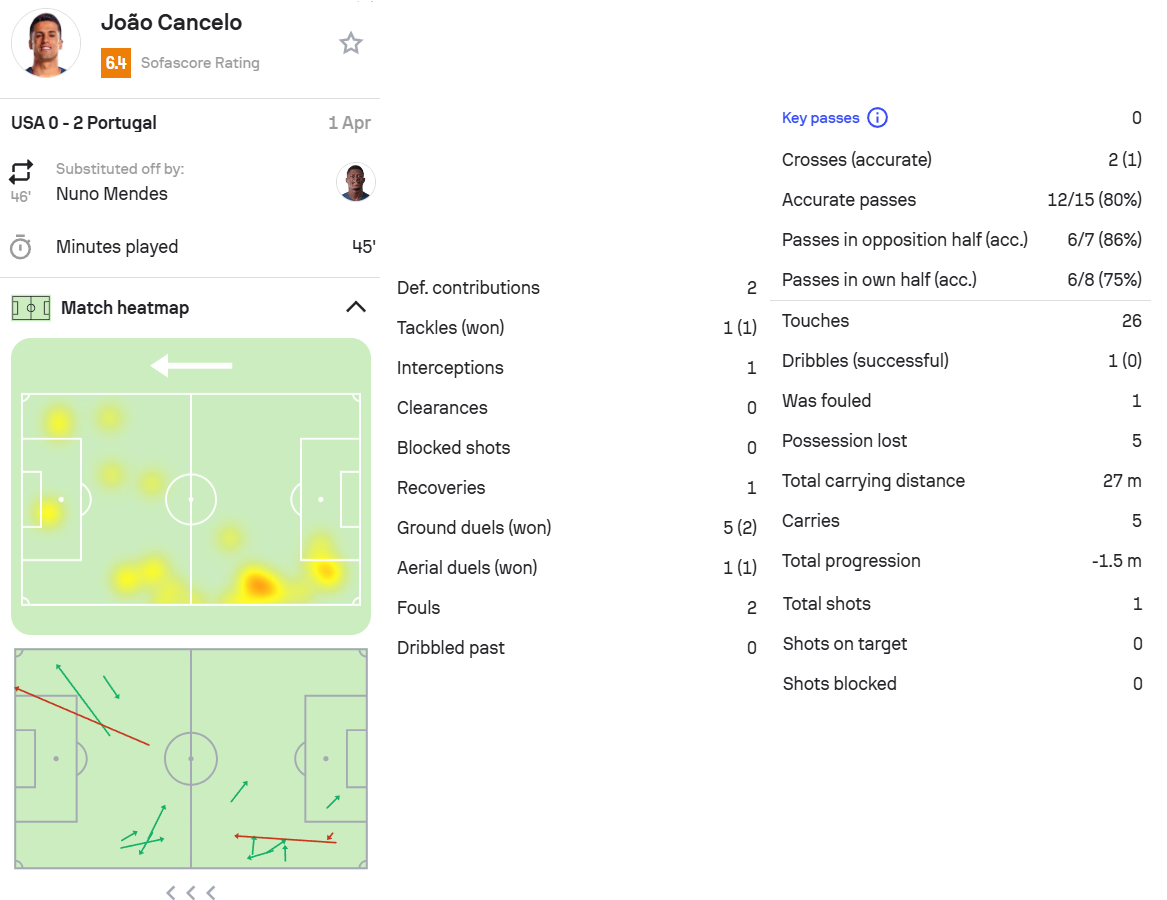 坎塞洛本场比赛首发出场45分钟,因犯规吃到黄牌,获评6.4分。