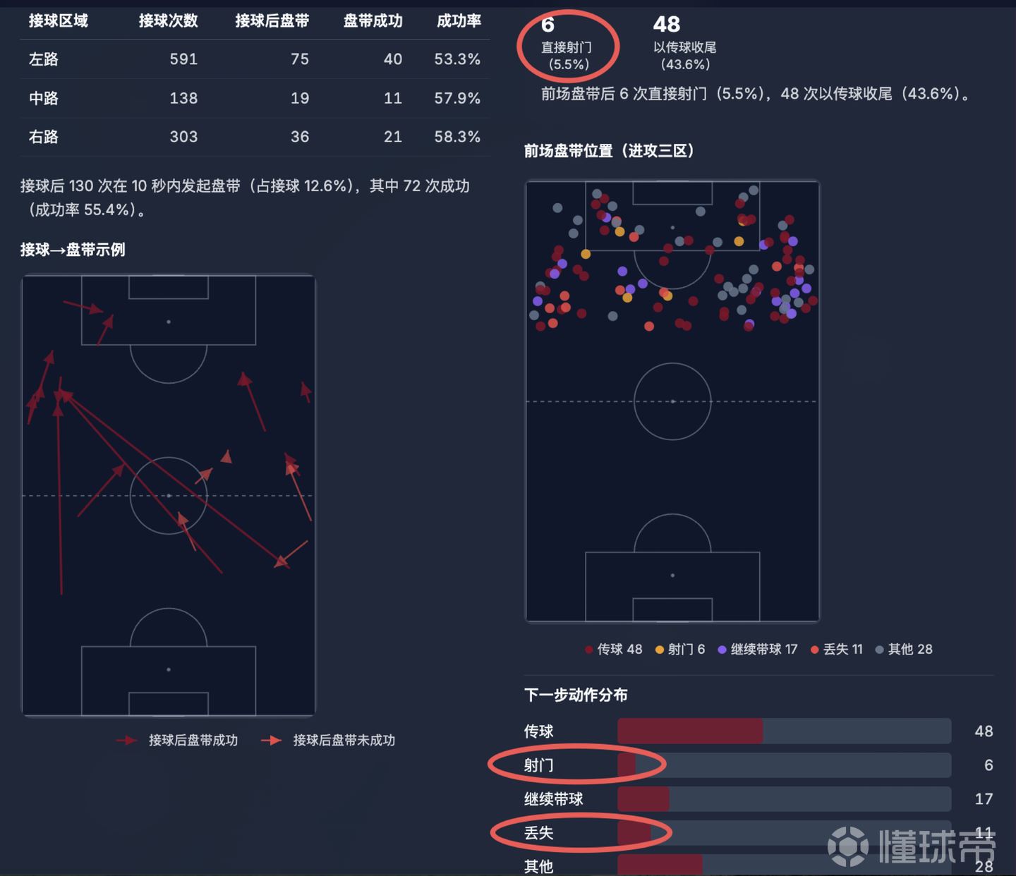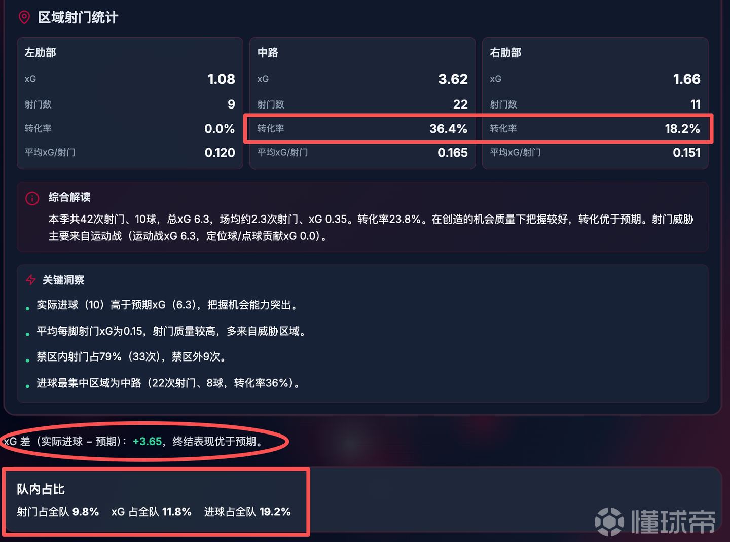 而在进球区域里,来自中路和右肋部的射门转化率奇高。