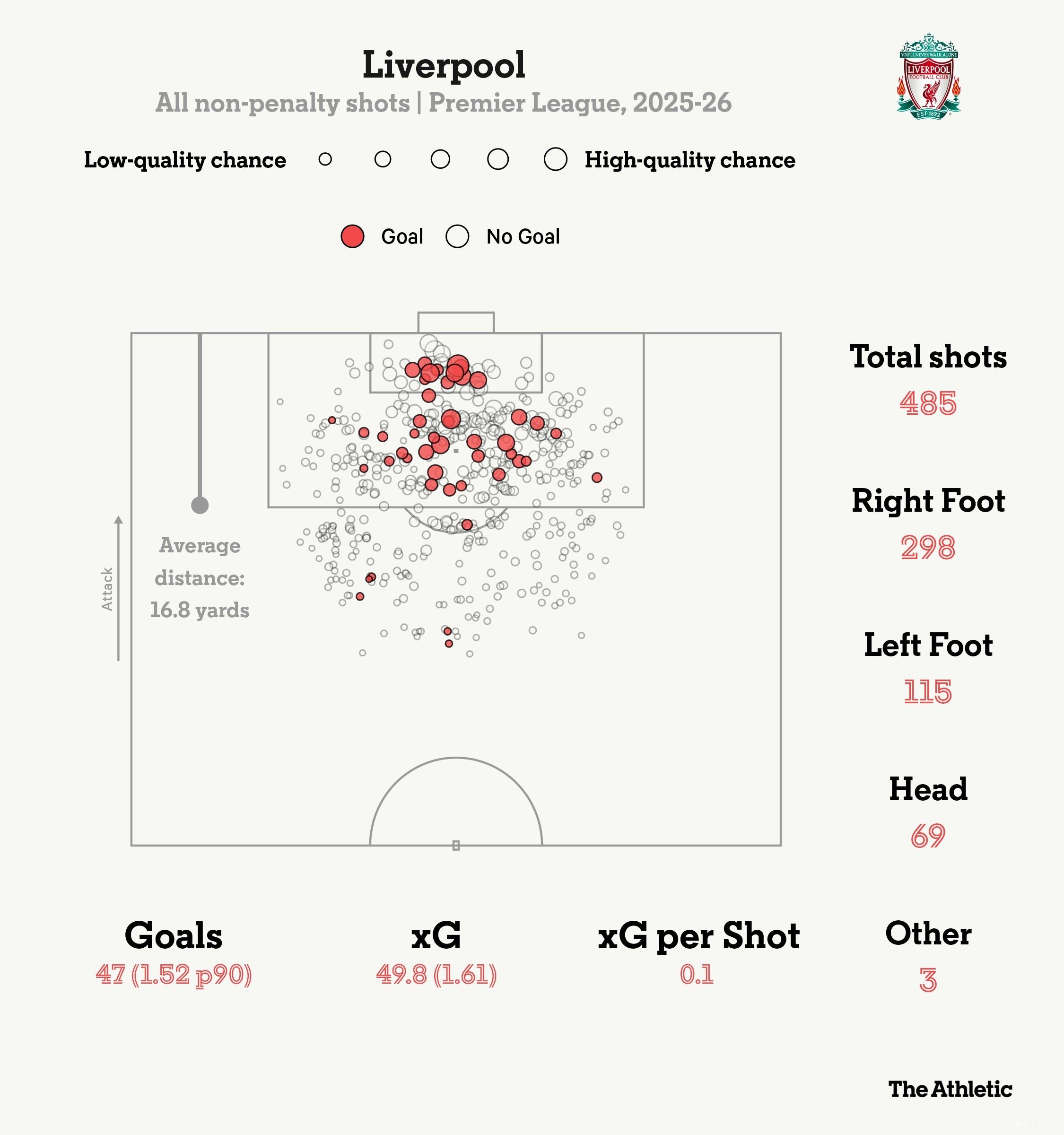 本赛季利物浦的射门距离稍微远了一些,导致每次射门的预期进球值略有下降。