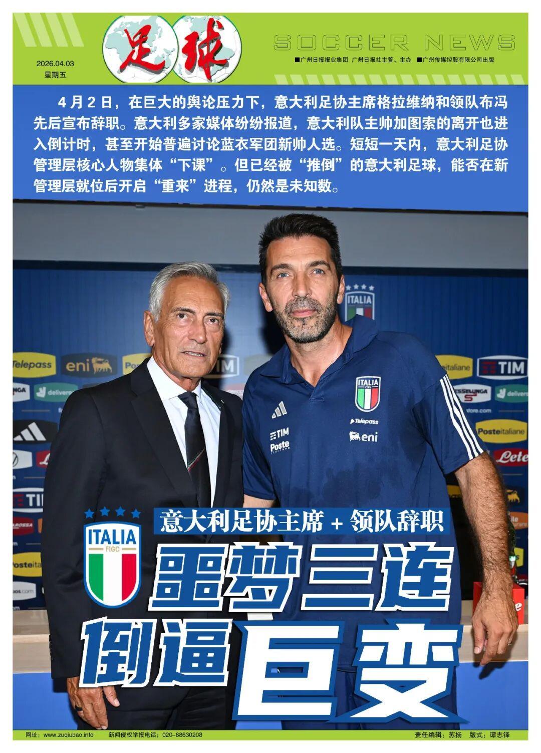 撰稿/寒冰连续3次无缘世界杯,终于迫使意大利足坛发生最激烈的巨变。4月2日,在巨大的舆论压力下,意大利足协主席格拉维纳和领队布冯先后宣布辞职。意大利多家媒体纷纷报道,意大利队主帅加图索的离开也进入倒计时,甚至开始普遍讨论蓝衣军团新帅人选。短短一天内,意大利足协管理层核心人物集体“下课”。但已经被“推倒”的意大利足球,能否在新管理层就位后开启“重来”进程,仍然是未知数。