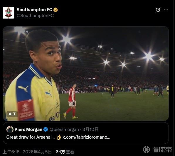 在足总杯1/4决赛2-1淘汰阿森纳后,南安普顿官方社媒挖出了知名枪迷皮尔斯-摩根在抽签结果出炉后说阿森纳抽到好签的帖子,并予以回击。