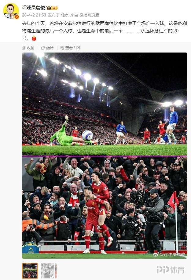 詹俊写道:“去年的今天,若塔在安菲尔德进行的默西塞德比中打进了全场唯一入球。这是他利物浦生涯的最后一个入球,也是生命中的最后一个...............永远怀念红军的20号。[蜡烛] ”