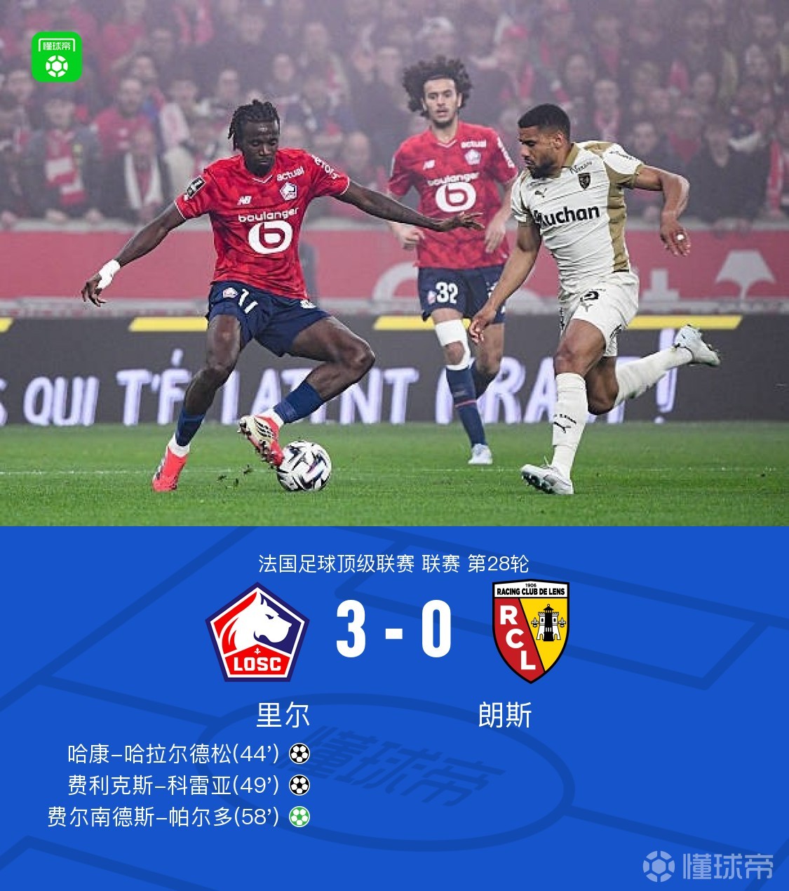北京时间4月5日,法国足球甲级联赛第28轮,里尔主场对阵朗斯。比赛中,帕尔多传射,哈拉尔德松、费利克斯-科雷亚分别破门。最终,里尔3-0战胜朗斯。