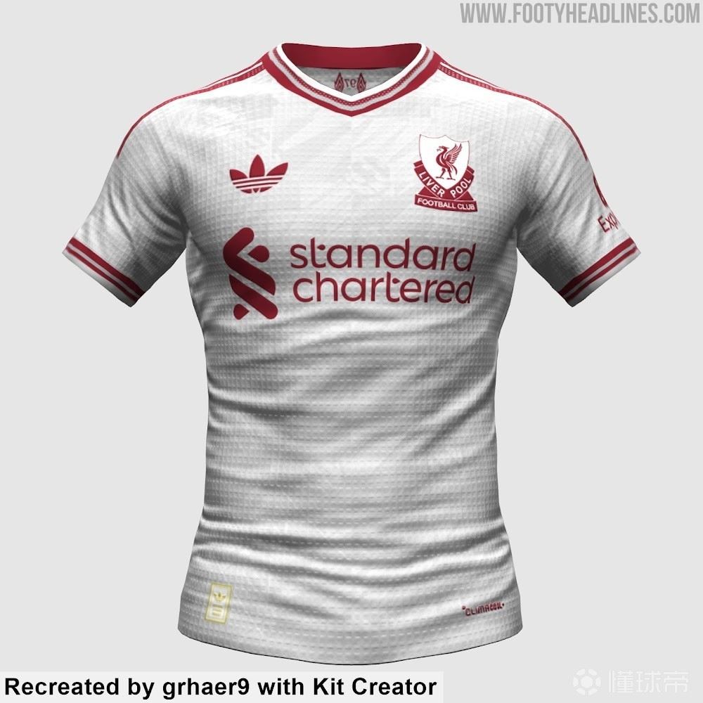 4月5日,足球装备网站Footyheadlines曝光了利物浦2026-27赛季客场球衣的设计细节。这款由阿迪达斯打造的客场球衣以白色为主色调,搭配栗红色的徽标,并在前胸采用独特的盾牌式徽章图案,灵感来源于1970年代的徽章设计。