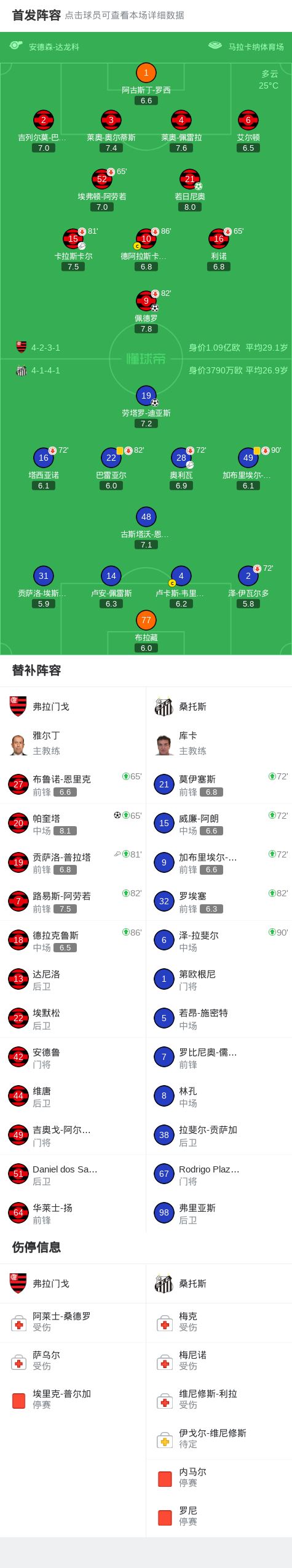 北京时间4月6日巴西足球甲级联赛 联赛 第10轮,弗拉门戈主场对阵桑托斯。弗拉门戈佩德罗破门,帕奎塔破门,若日尼奥破门。桑托斯劳塔罗-迪亚斯破门。最终比分弗拉门戈 3-1 桑托斯。