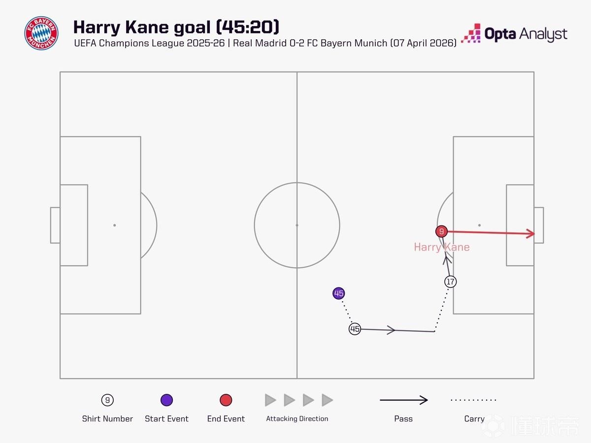 此役客场对阵皇家马德里,凯恩在下半场开场仅20秒便取得进球。