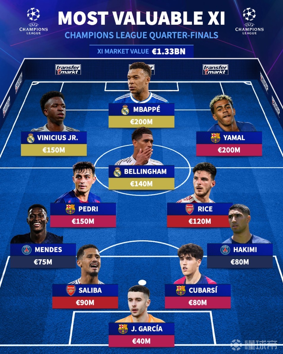 北京时间4月7日,在欧冠1/4决赛首回合的比赛即将打响的情况下,德转列出了参加1/4决赛最贵的11人阵容,姆巴佩和亚马尔2亿欧元领衔,巴塞罗那4人入选,皇家马德里3人,阿森纳和巴黎圣日耳曼各有2名球员上榜。