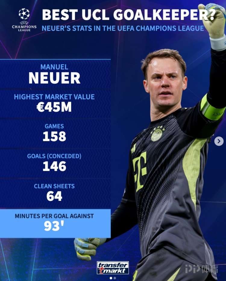 德转也列出了诺伊尔(巅峰身价4500万欧元)欧冠生涯关键数据:出战158场,丢146球,完成64次零封,平均每93分钟丢1球。