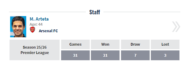 输球后被问到外界的批评,阿尔特塔说:“从赛季初就是这样,大家对球队的期望太高了。这就是你得接受和面对的。没人会比我们自己更严格,这一点毫无疑问。”
