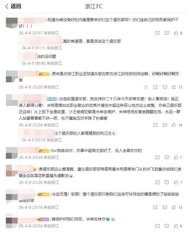 中超第4轮的争议余波未平,浙江队的一纸内部罚单,彻底点燃了球迷的怒火。米特里策薅对手头发、怒踹赞助商冰桶的行为固然违规,中足联追加停赛4场+罚款4万元的处罚已属严惩,可浙江队紧随其后的6万欧元(约48万元)重罚+通报批评,却让无数浙江球迷破防,官博评论区被“软蛋”“冷血无情”的怒斥刷屏,满屏的“心寒、失望”,道出了球迷的无奈与愤怒。浙江队的做法,看似合规守矩,实则寒了球员的心、凉了球迷的情,更是一场得不偿失的公关灾难。