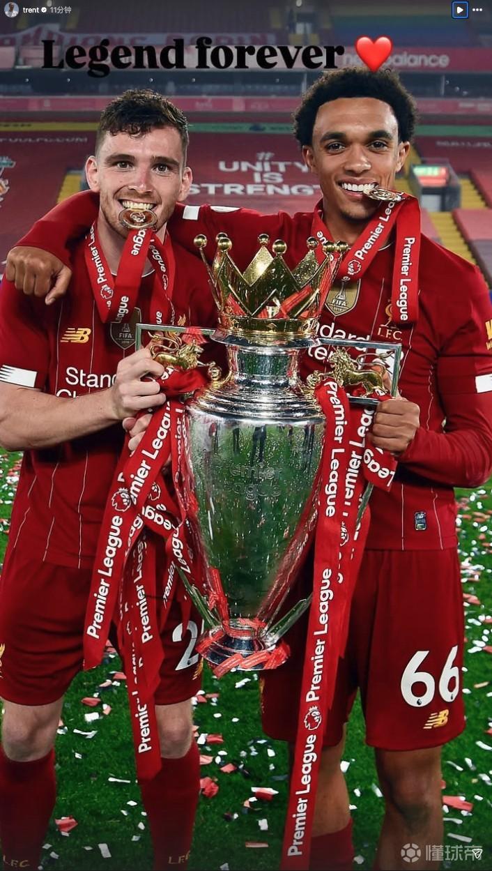 去年夏天离开利物浦的阿诺德在社交媒体晒出他和罗伯逊在2019-20赛季手捧英超冠军奖杯的合照,并配文:“永远的传奇❤️”