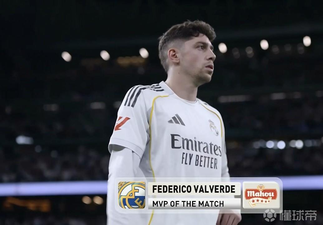 西甲第31轮,皇家马德里主场1-1战平赫罗纳,此役打入一球的皇马中场巴尔韦德当选西甲官方全场最佳球员。