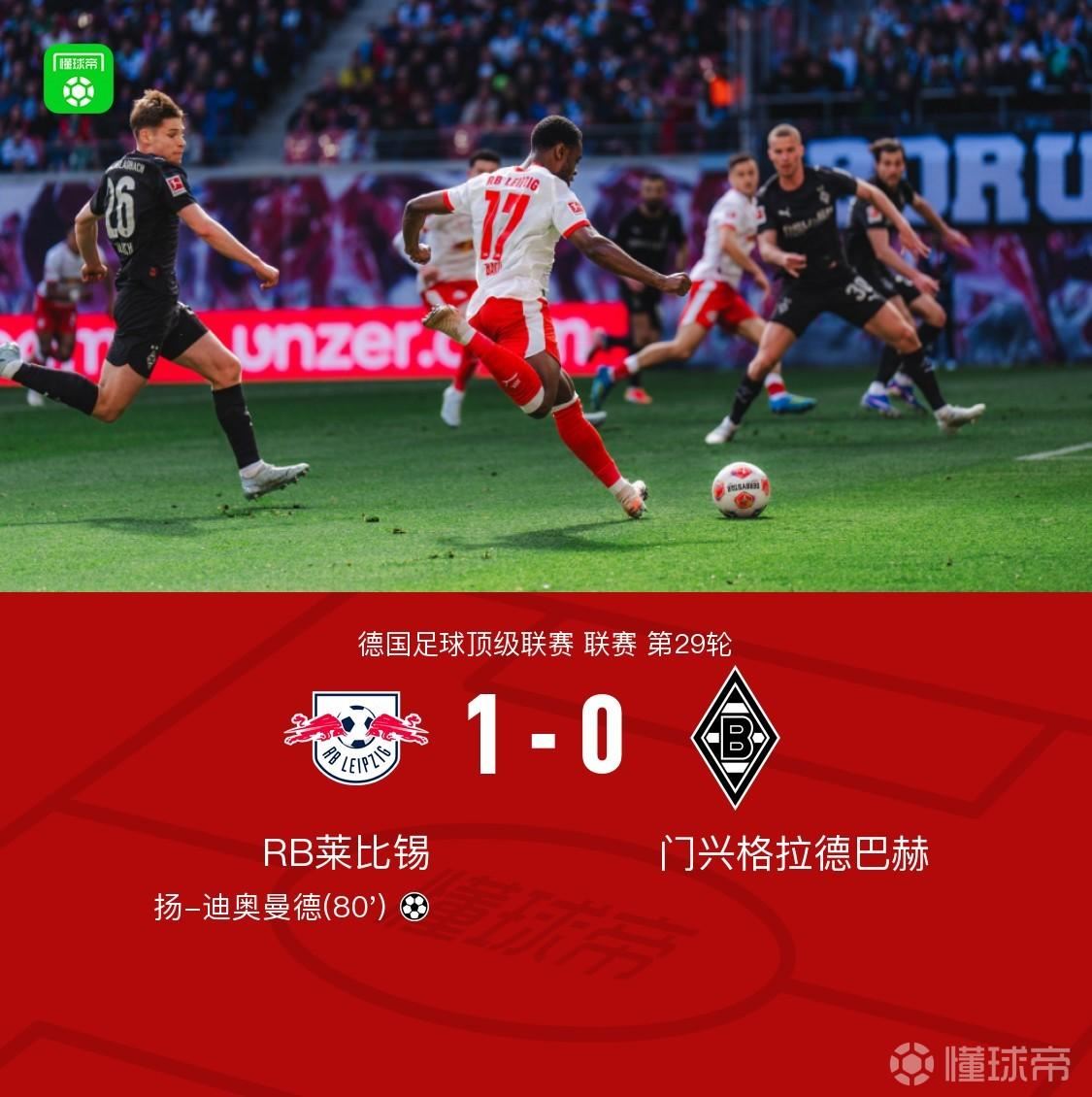 北京时间4月11日德甲联赛 第29轮,RB莱比锡主场对阵门兴格拉德巴赫。扬-迪奥曼德左路抽射破门打进全场唯一进球,巴库屡造威胁,劳姆精彩远射被扑出,基亚罗迪亚射门击中横梁,施拉格尔门线解围。最终,RB莱比锡主场1-0小胜门兴格拉德巴赫。