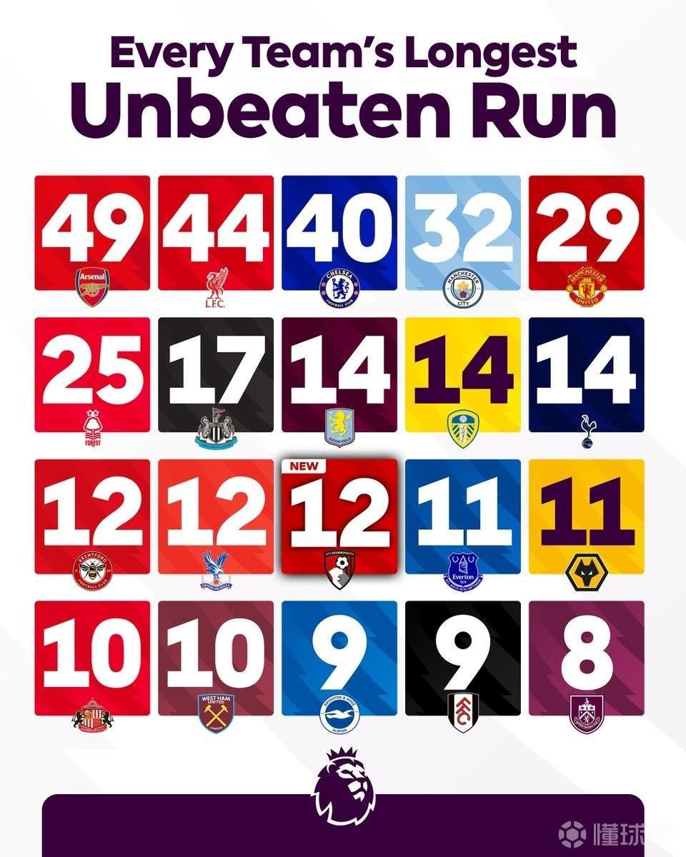 在伯恩茅斯创造队史英超最长不败纪录后,英超官方列出本赛季英超各支球队的历史英超最长不败纪录。