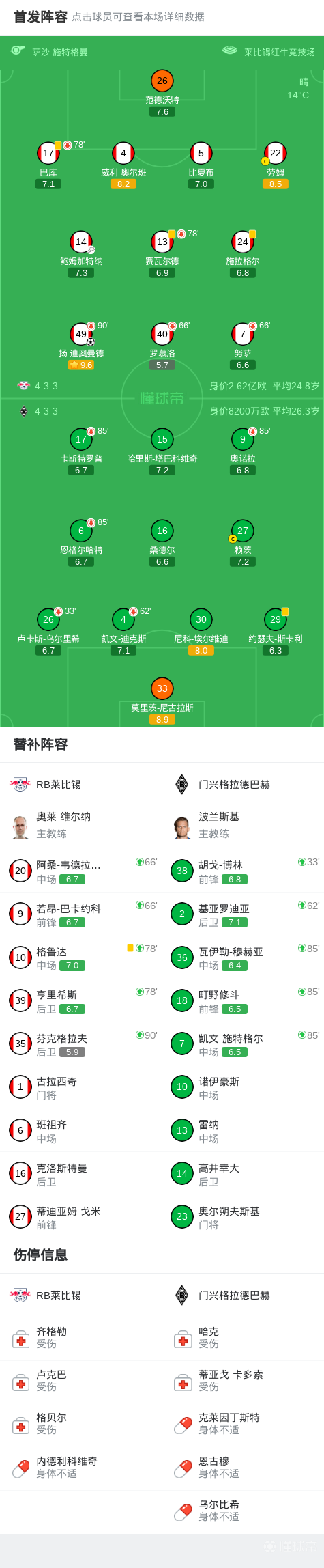 北京时间4月11日德甲联赛 第29轮,RB莱比锡主场对阵门兴格拉德巴赫。扬-迪奥曼德左路抽射破门打进全场唯一进球,巴库屡造威胁,劳姆精彩远射被扑出,基亚罗迪亚射门击中横梁,施拉格尔门线解围。最终,RB莱比锡主场1-0小胜门兴格拉德巴赫。